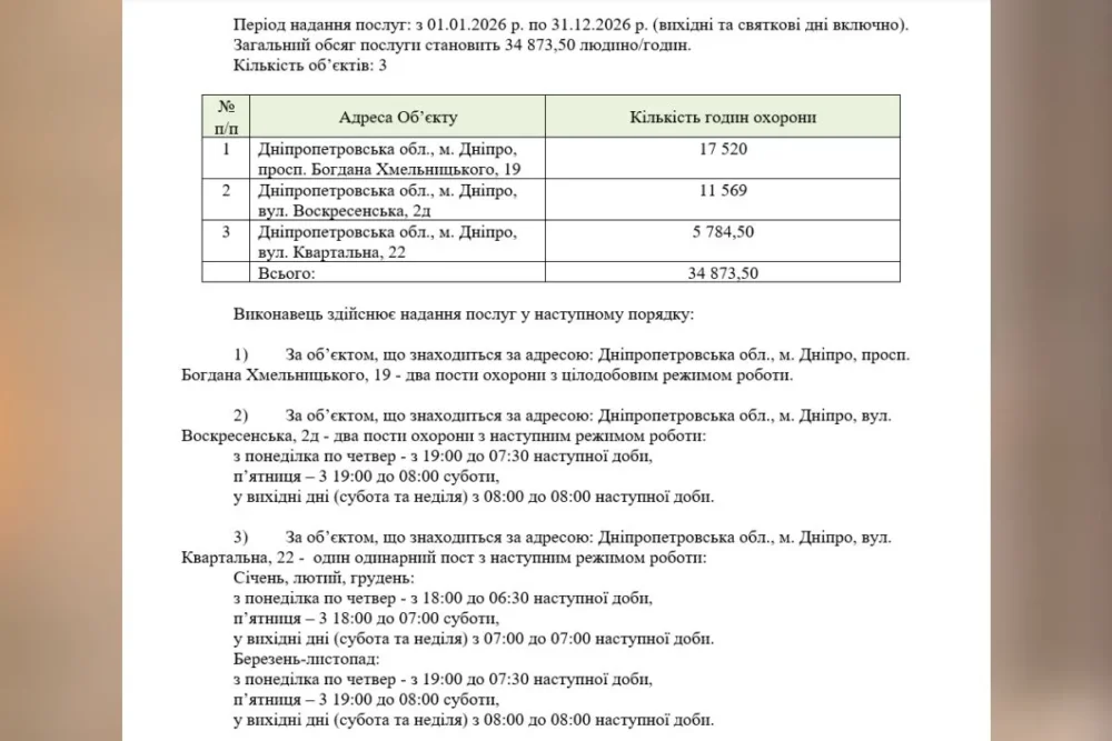 Майбутній підрядник зобов’язаний забезпечувати охорону цих об’єктів протягом всього 2026 року — з 1 січня по 31 грудня. Поки що відомо, що охорона стосуватиметься трьох укриттів у різних районах міста. Точні адреси об’єктів зазначені в тендерній документації.
