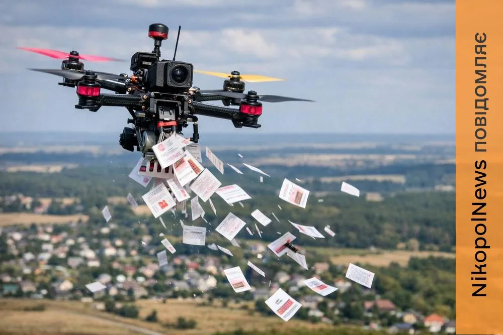 Окупанти знову розкидують у Нікополі листівки з ворожою брехливою пропагандою. Такий скид з дрону було здійснено сьогодні, 9 березня. Фото листівки надали підписники газети Nikopolnews. Росіяни намагаються залякати мешканців, обіцяють «звільнити місто», прагнуть поширити панічні настрої.